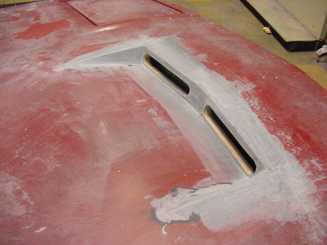 My junkyard hood had been in a front end collision so the bracing was already broken loose, this may not be so easy to remove on most hoods but it sure makes the 'glassing a lot easier and cleaner looking and provides better clearance.