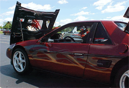 17" DEZENT T wheels with 215/40 tires front and 235/45 rear, KONI shocks, EIBACH lowering springs, PU dog bone, bushings and engine mounts, K&N air and oil filters, OZELOT exhaust, Mercedes SLK yellow, Mr. Mikes seats, door skins, shift and e-brake boots. MP3 player and custom subwoofer behind passenger seat, F355 style front. Fiero Store rear swaybar, strut tower brace, black carpet. Rodney Dickman's competition short shifter.