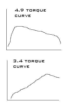 The 4.9 does not hold peak torque through the rpm band. Past 3000 or so rpm it starts falling, and by 5000rpm is has the same or less than the 3.4tdc.