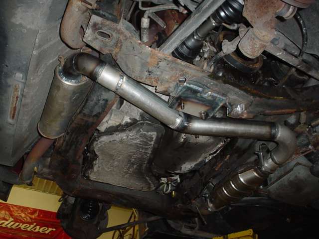 I used two Eldorado/Seville front manifolds and a custom Y pipe, similar to the one that Rockcrawl has on his page, but with a bottle muffler instead of the Flowmaster: http://www.fieroaddiction.com/caddy49f.html
