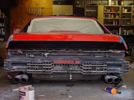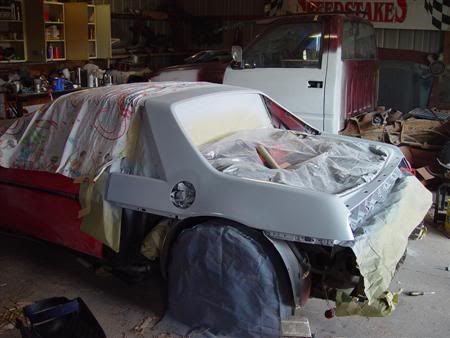 few more pictures.. we pretty much re-aligned the back end it was off by a mile decklid didn't sit flush with the body and the tail lights were pushed together on one side. We got a little primered and what not, it was getting late and we called it quits. I'll post back when I get updates