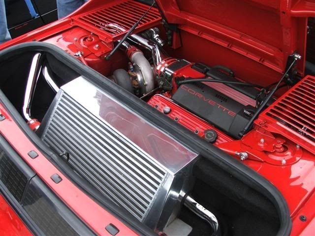 I'll have to ask my son which one he put in, Im thinking it's a T-27 but Im probably wrong. I know he spent a lot of time mapping dif size turbos to my requirements before he selected one. I'm only runing 7lbs now, but I have 9:1 or 9.2:1 pistions and had the shave a tiny bit. My son wants me to bump it up to 10-12lbs, but with the headers I made for it and our intake, Crane cam, head work, MSD, etc etc, it's more than fast enough to be fun. Every pound additional of boost puts more load on the engine, so.... but more power.. hmm.. Oh, I would not bother with a water/air intercooler. If your not going to go above 14lbs (i would not go above 10-12 with a 2,8 that you drive a lot) an air intercooler will surfcie fine. Just put a good size fan under it and maybe pull cooler outside air down through it like my setup and use scoop (dont have be as huge as mine) with a fan under it to extract that air. I have a thermostate on that extractor fan you see on my deck lid and my engine compartment never gets really hot. one other ques, are you going to Carlislie this year?