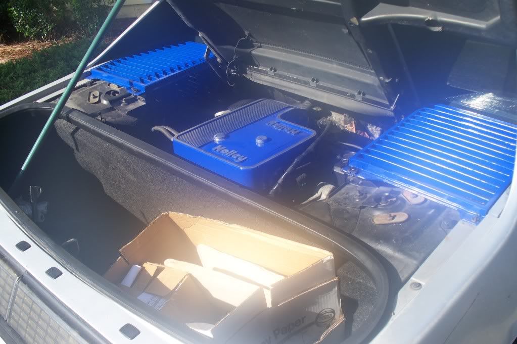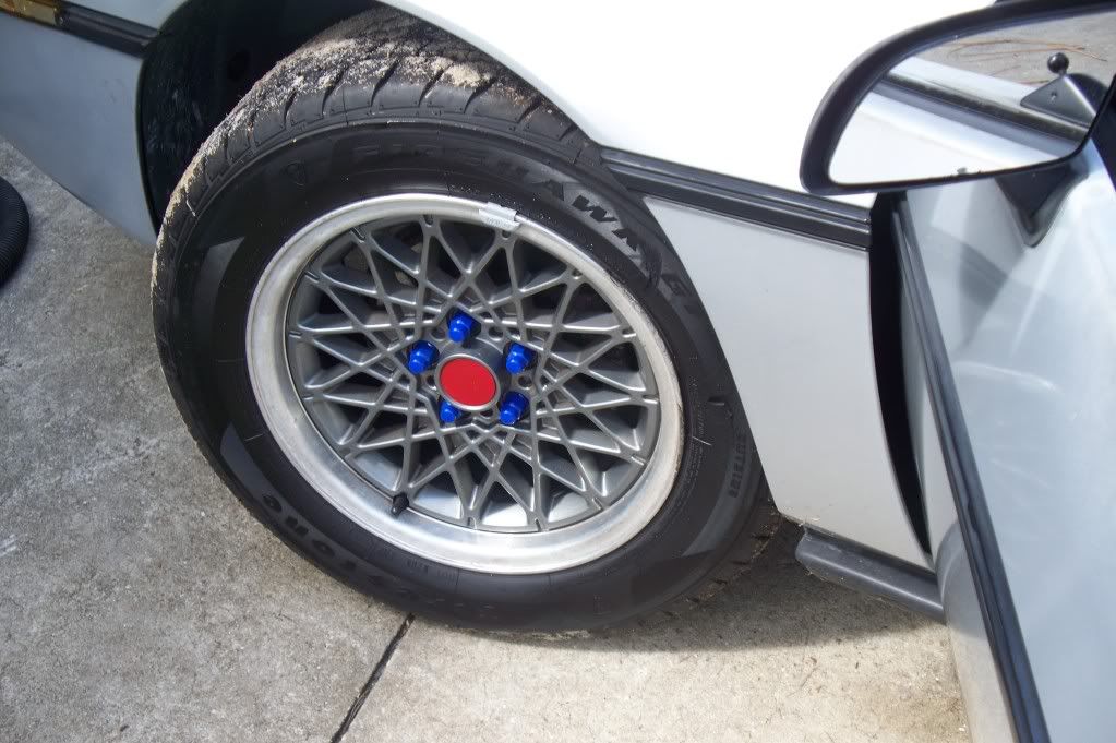 Whats with the colored lugs? The orange ones you got aren't bad, but the blue looks kinda cheesy/gaudy in my opinion. The blue really doesn't go with the rest of the car, me thinks. Is he planning on painting the car?