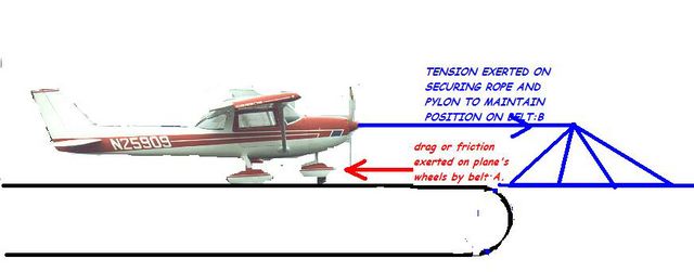 Here is the definitive article!! When the conveyor belt is stationary, so is the plane. And the forces described in the picture are nil. Start the conveyor belt. As the tethering mast/rope initially have to overcome inertia, the load on the tethering pylon is greater, until the wheels start turning.It then decreases, once inertia is overcome, and remains steady.By a VERY crude experiment, I have worked out the coefficient of inert mass weight to actual force to overcome the inertia OF that weight..it is roughly, 7%.of the weight of the object, in ft/lbs. In other words if the plane weighs 1000lbs, it will exert 70 ft/lbs of load on the tethering pylon to keep the plane in place.NOW!!!!! Replace the tether mast AND ROPE with an engine and propeller, exerting 70ft/lbs of THRUST on the STATIONARY AIR surrounding the plane, and the plane will STILL stand still!! NOW...if you speed the conveyor belt up by 100%...does the load on the tether, or the engine/propeller increase by 100%? NO, IT DOESN¨T! It increases at a rate of 7%, not 100%. And so, even if the conveyor belt can speed up to 10000 mph, it does NOT exert more force on the tether at a greater rate than 7%. So, by that equation, if it takes 70 ft/lbs of thrust to keep it stationary, it will only take the normal thrust, PLUS the 70 ft/lbs, to enable the plane to move forward, and take off.