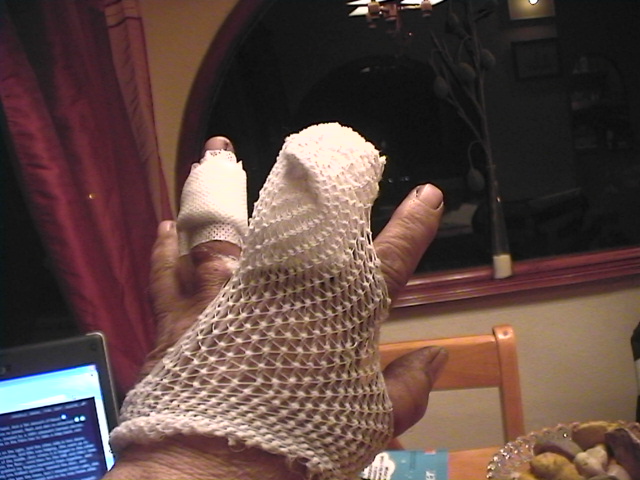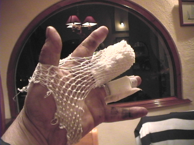 Improving rapidly!! No infection at all now. The wound is dry, and pain free.I can bend the finger reasonably well, considering it has only been 4 days!! Wish I could clean it up all around the damage, but I mustnīt get it wet, so...dirty it stays!! Nick