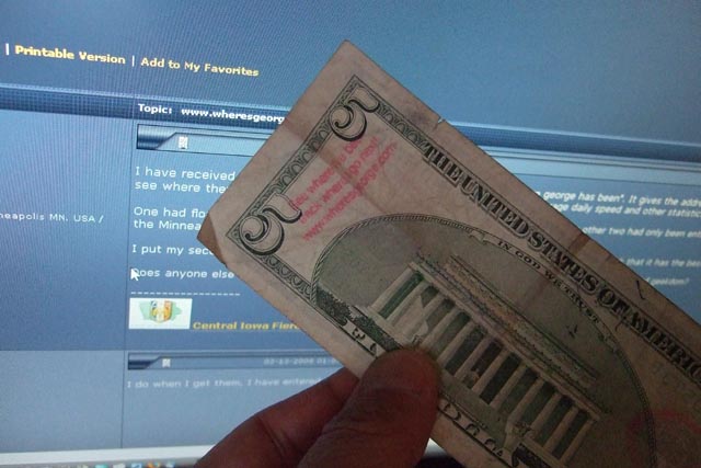 I have received three dollar bills with a message that says, "See where george has been". It gives the address www.wheresgeorge.com . So far I have entered three bills. Its kind of fun to see where they have been. It tells where it was last entered and the average daily speed and other statistics that are interesting.