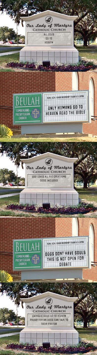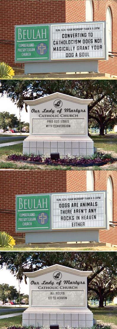 My wife just sent me this. Thought I'd share. ------------------------------------------------------- This is literally a "church signs" debate, being played out in a Southern town, between the Catholic church and a (fundamentalist) Presbyterian church. From top to bottom shows you the response and counter-response over time.