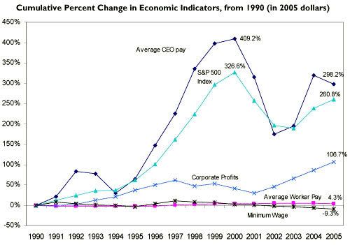 I think that this may all come down to the pay for executives vs. "the little guy". Below is a chart that diagrams the payscale increase / decrease for both since 1990. It retty much speaks for itself. Yeah, I am jealous and want to make that kind of money, (and plan on doing it in the future), but when you look at the disparity between the two, it is just outrageous.
