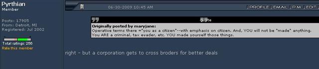 Originally posted by maryjane: Operative terms there ="you as a citizen"--with emphasis on citizen. And, YOU will not be "made" anything. You ARE a criminal, tax evader, etc. YOU made yourself those things.