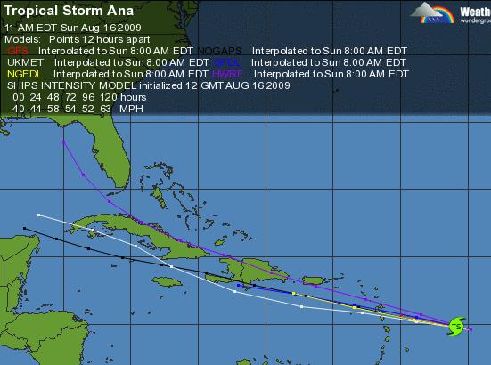 As you can see from the quote, there is considerable disparity in the tracking models of just those 4 underlined models, and there are many other models out there, not mentioned in this NHC Advisory #18. Some models suggest a continued westerly track, some suggest a northern turn toward the NW. Currently, Ana is following the early track of Hurrican Ike.