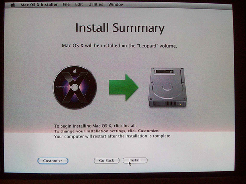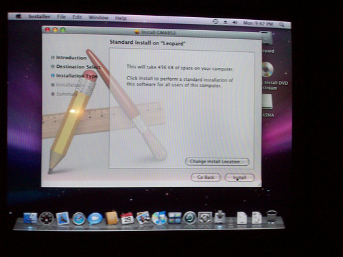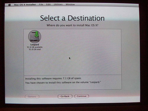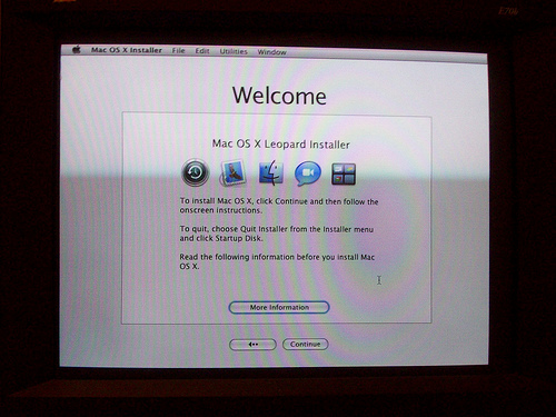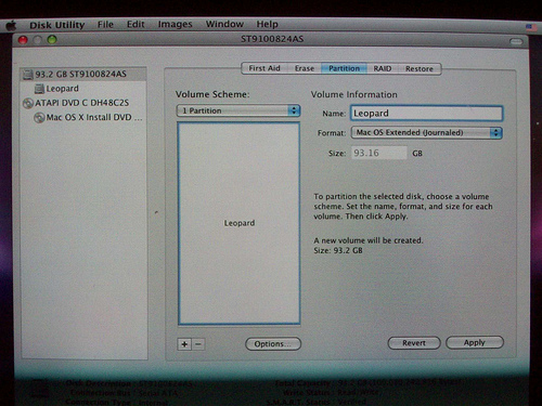 Now follow the steps to partition the drive 1 partition as Mac OS journaled (name it something pretty like Leopard), hit apply then tell it to apply again. When you get to the license agreement *do not read it;* a small kitten may die if you do.[/color]