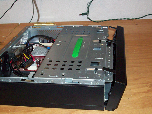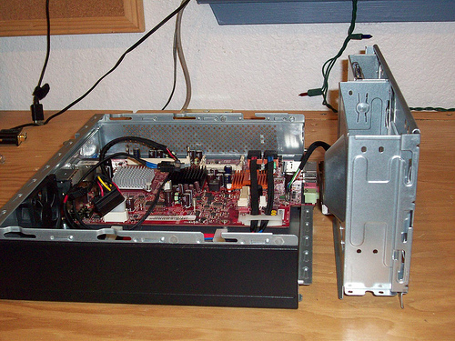 Part 1: MSI is a company known mostly for its PC components. They recently jumped into the netbook bandwagon with just about every other major pc manufacturer. They make a not too well known desktop with roughly the same dimensions as a ream of printer paper, called the MSI Wind. The MSI Wind PC is a great little computer; It comes with a 1.6GHz Intel atom CPU, two SATA connections for 3.5" and 5.25" bays and 6 USB ports. You can pick a barebones one, requiring ram, a hard drive and possibly DVD drive, for $140 or so.