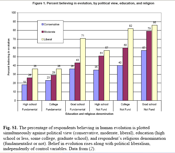 Well Marv, based on the graph it seems schools teach evolution. That combined with a want to fit in might contribute. I think "fund" or fundamental might be open to interpretation maybe. I suppose it could be considered leftist to insist that for one not to believe in evolution they must be less intelligent.