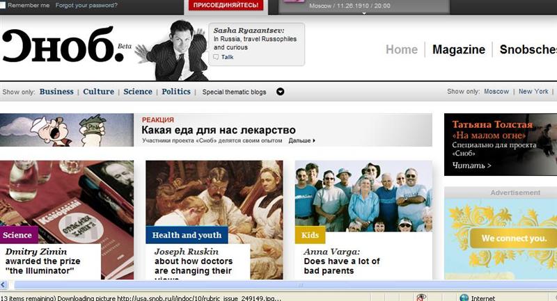 "Snob is an international project and a one-of-kind social medium for people, who live in various countries around the world, speak various languages but think in Russian."