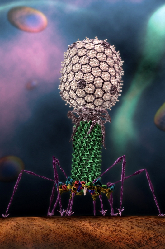 The T4 Phage initiates infection of an E. coli bacterium by recognizing cell surface receptors of the host with its long tail fibers (LTF). A recognition signal is sent through the LTFs to the baseplate. This unravels the short tail fibers (STF) that bind irreversibly to the E. coli cell surface. The baseplate changes conformation and the tail sheath contracts causing GP5 at the end of the tail tube to puncture the outer membrane of the cell. The lysozyme domain of GP5 is activated and degrades the periplasmic peptidoglycan layer. The remaining part of the membrane is degraded and, DNA from the head of the Phage can travel through the tail tube and enter the E. coli.