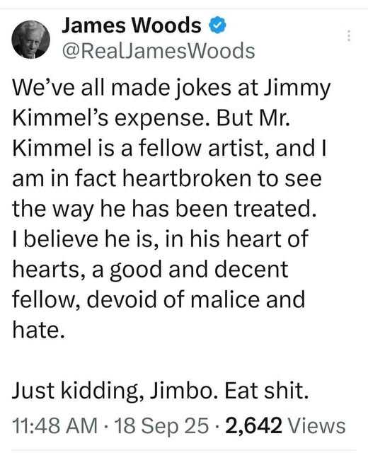 Didn't see Kimmel's monologue although I did see Senator Cruz's response to the Kimmel issue. I pretty much agree with the Senator. While I do consider Kimmel's initial monologue on the assassination of Mr. Kirk as vile, a lie and very inappropriate, I also believe that ratings/viewership should drive what's on the airwaves and Disney had the right to cancel who and what they sponsor. I guess we'll see how future rating reflect the quality of programing.
