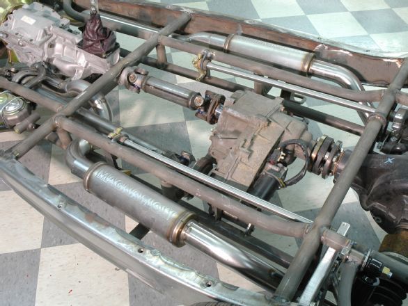 Here is an example of just how wide the transfer case is. This guy has the transfer case in the back instead of attached to the rear of the transmission, but that is a custom setup. The main reason for showing the pictures is to let you see exactly how far apart the driveshafts are so you can see how much cutting would be required to get that type of an AWD setup in a Fiero. That driveshaft on the driver's side would be in the driver's side foot well. You can't even offset the two because the main driveshaft still goes straight back from the engine so you would need to offset the entire engine. I still stand by the FWD type layout from a Vibe or minivan or the 6000 ste awd such as below. Then just replace the motor with whatever you want.