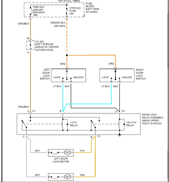 The Fiero uses a positive trigger door lock relay. This means power is applied to the relay coil via the lock/unlock switch and the coil grounds through the metal housing. Most aftermarket systems are a negative trigger. If your system is a negative trigger you will need to use a pair of relays to activate the factory power lock relay.