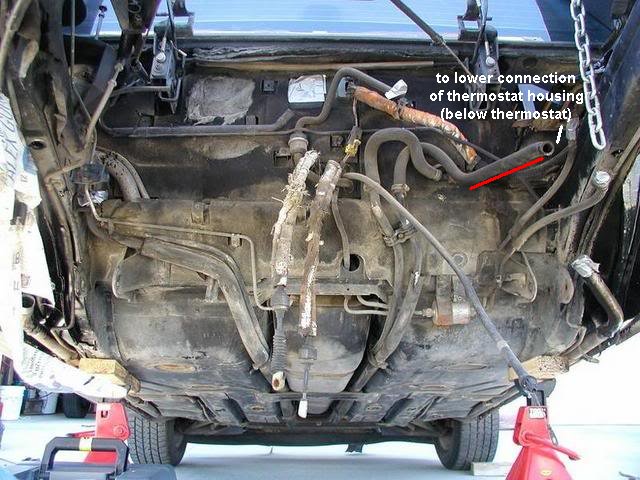There seems to be some confusion here. The two heater core tubes are on one side of the gas tank, and the A/C lines are on the other. When I mounted my battery up front, I ran the cables along the gas tank where the A/C tubes used to be after I tore out the A/C.