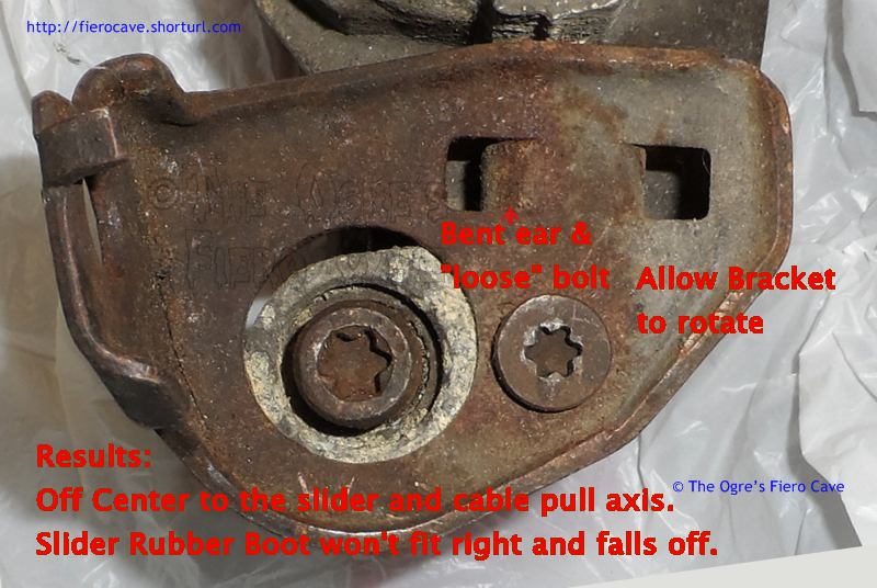 Is bad enough caliper cable bracket uses 1 bolt and bit of bent metal to keep the cable in place. Often the bolt isn't tight or parts "rust" and bracket works loose some and causes cable and slider problems... Bent side should be identical to the right tab but bent almost to clear the caliper. Tried to remove the bolt to fix but nothing and high risk wrecking the Torx hole and/or head. (Can see some load damage on T45 or T47 head...) Likely part of reasons why people have problems adjusting the cables.