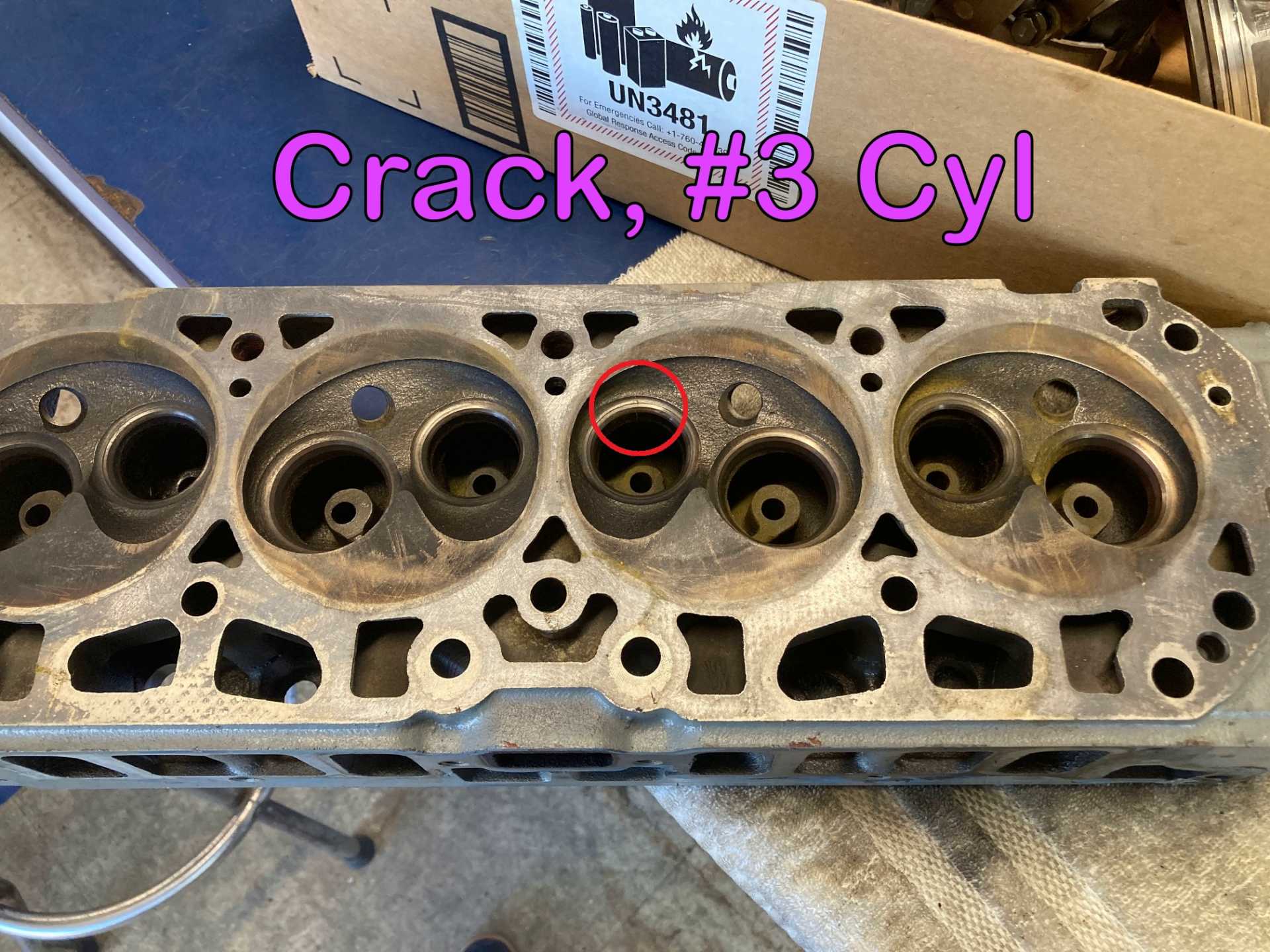 So, just to confirm what I'm showing here, it's a crack on the exhaust port of the #3 cyl, which is directly next to a water port in the cyl head.