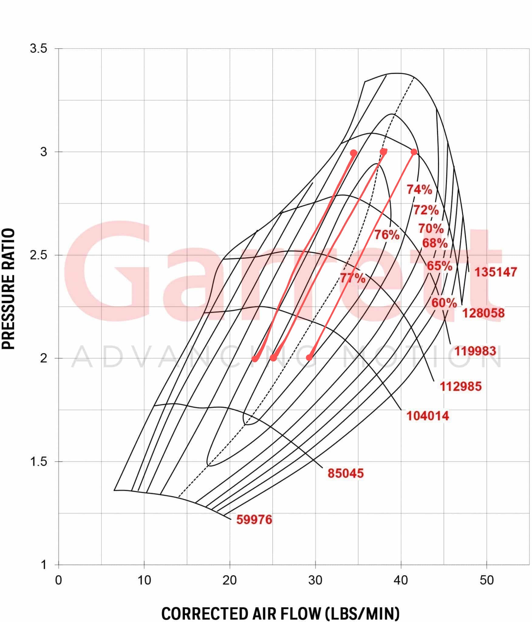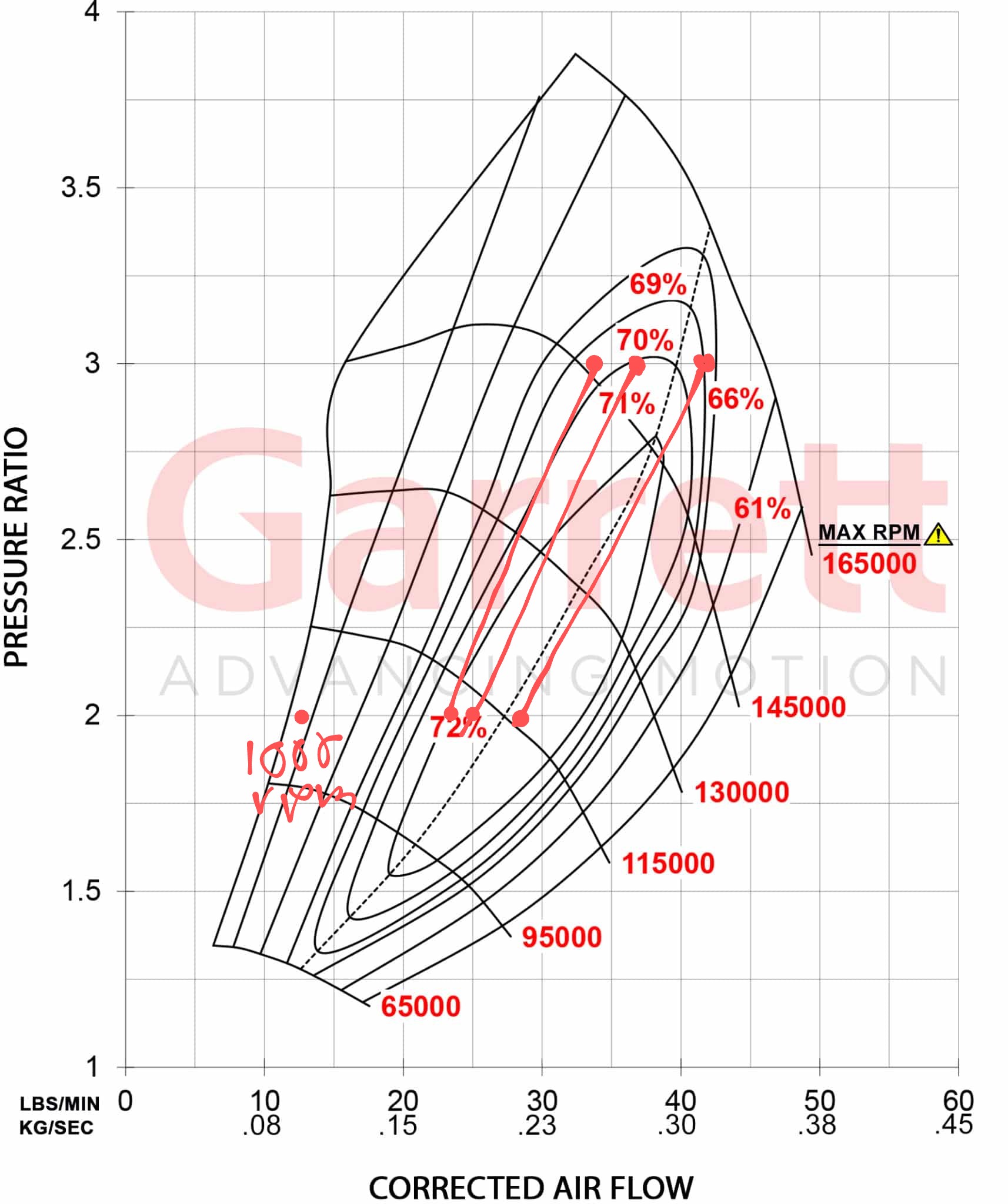Originally posted by 1985 Fiero GT: On the compressor map for the 2871 turbo, 150hp at a pressure ratio of 2 is right on the line for 68% efficiency, very close to the surge region, but not there yet.