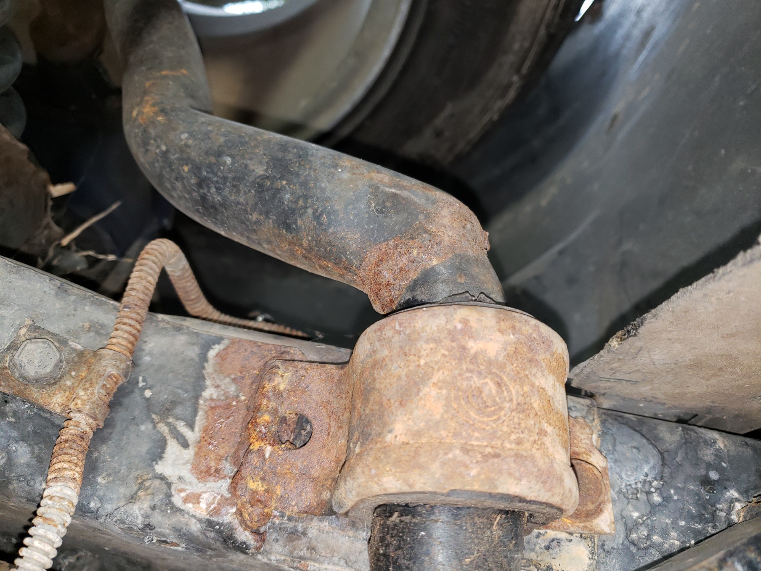 My guess is they broke the bolt off and then decided to just weld the bracket back on. The bar is crazy too... no idea what's going on with that. Maybe they cut it because they couldn't get it off, and then decided to weld it back on again?