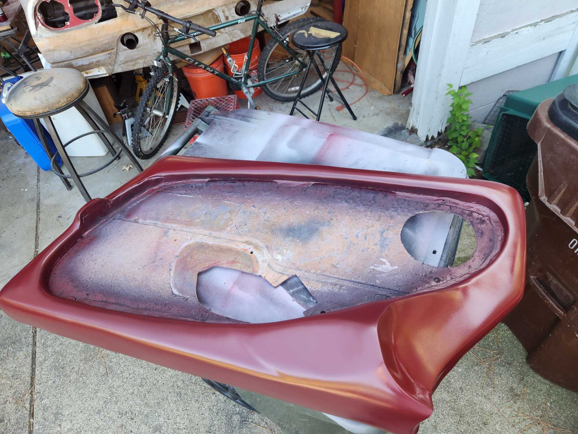 I pulled all of the panels out of storage. They have been cleaned and painted SEM Napa Red. I pulled the dash out last weekend, it is also now Napa Red, with silver and black accents. I also pulled off the door I created for the airbag cover, went to the scrap yard and pulled a mint cover that will be installed, but I ran out of paint, so that's on order.
