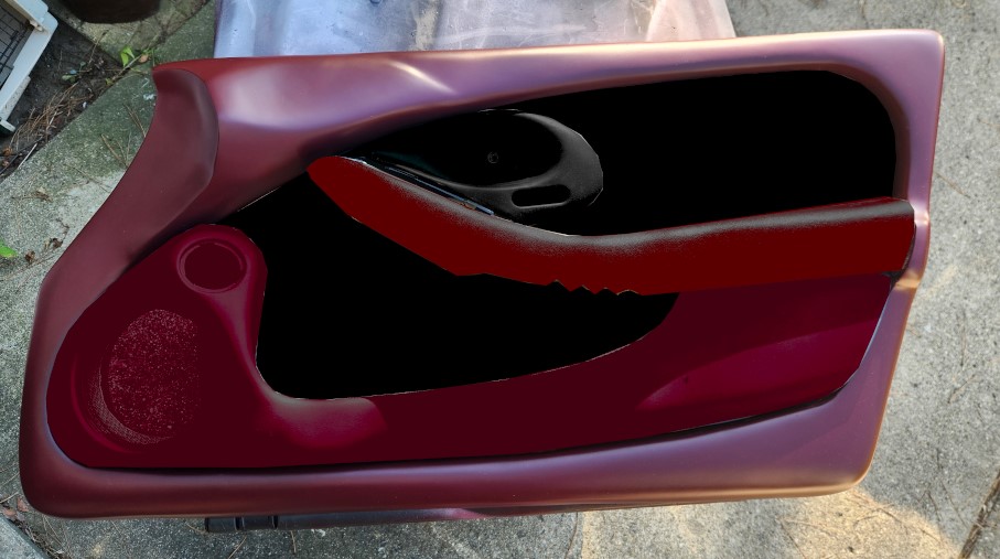After playing in GIMP for a while, I think I'm going with the pull and bottom cup holder in napa red, and the door latch in black. The middle insert will be black suede.