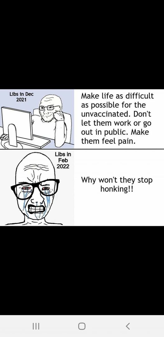 Patrick, you may not like how I say things, but they aren't personal attacks on you. They are very functional thoughts and questions. I have not said anything that you couldn't reply to with a counter argument....meaning that you have an opinion and I do as well. You just seem to think yours is the only one. Yours isn't the only opinion, it is just one of many. This is exactly what I was talking about when I said wake up. The mandates are wrong and the truckers are doing the only thing left in dealing with a tyrannical government. A peaceful protest, unlike the burning, looting and murdering strategies used by antifa and blm.