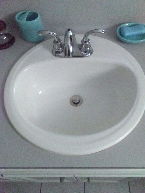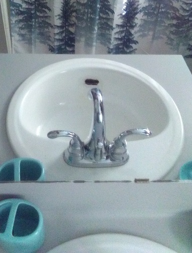 Look at the same sink in the mirror reflection..overflow is chipped, missing porcelain and rusting out. (a habitat for humanity reject? )
