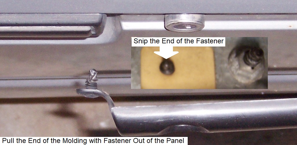 Back to the inside of the door, I next ‘snipped’ the end of the small ‘Christmas tree’ or ‘carrot’ type push fastener, which was holding the molding under the door handle. With the fastener loose, it was easy to pull the rear end of the molding from the outer panel.