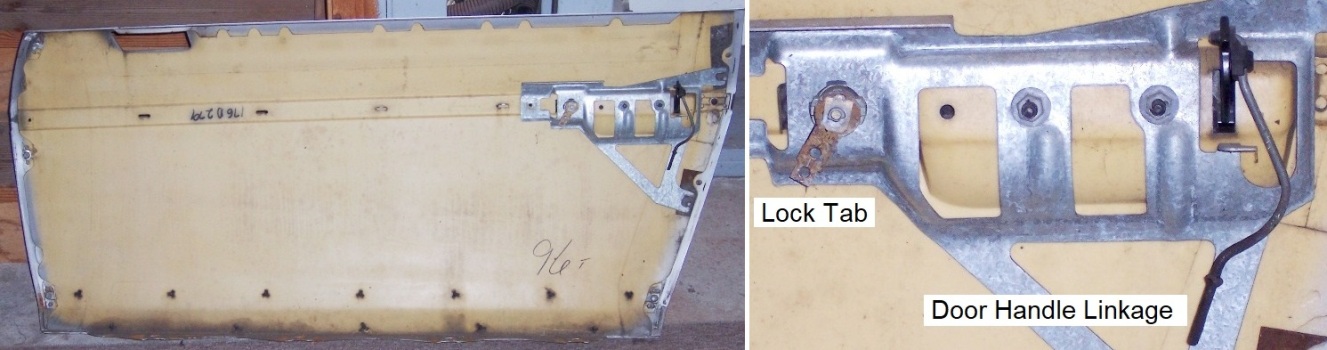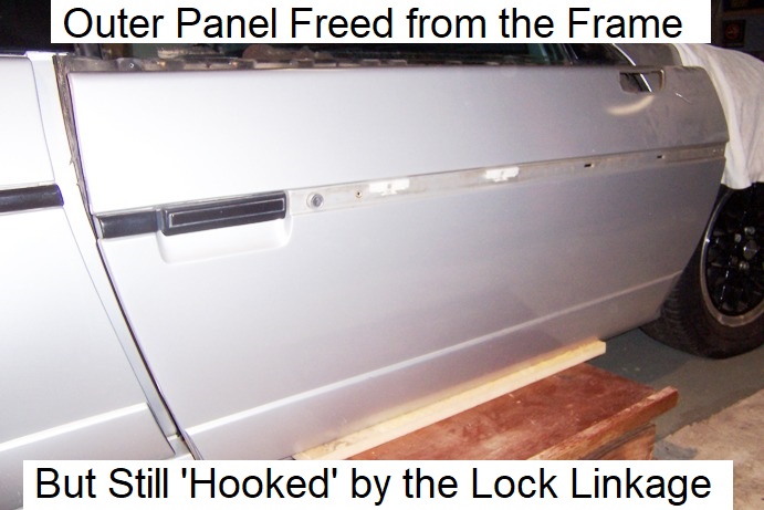 NOTE: By lifting the panel up from the frame, the door handle linkage slides out of the latch; notice where the rod exited the latch for reassembly. I can already see that when putting the outer panel back on the frame, ‘dropping’ the door handle linkage back into the latch will be tricky, but I’ll cross that bridge later.