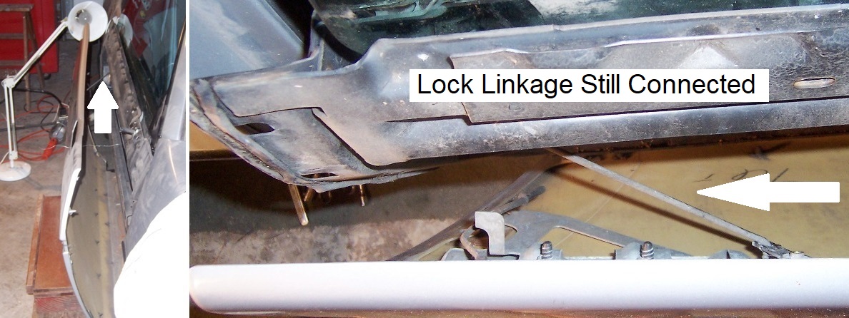 The next step is a little awkward which is disconnecting the lock linkage from the outer panel.Don’t attempt the lock linkage from the inside of the door, many tried. The best method to release the lock linkage is when the outer panel has been ‘freed’ from the door frame.